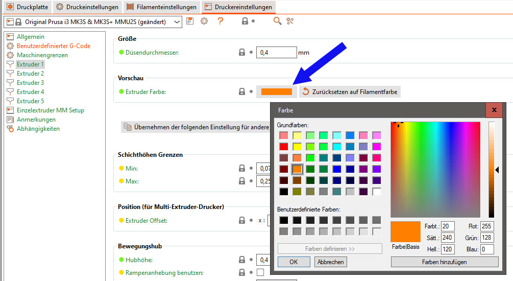 Sie können übrigens die Filament-Farben im Slicer unter Druckereinstellungen/Extruder 1-5 im Prusaslicer einstellen, dies ist stark empfohlen, um die Übersicht zu behalten: