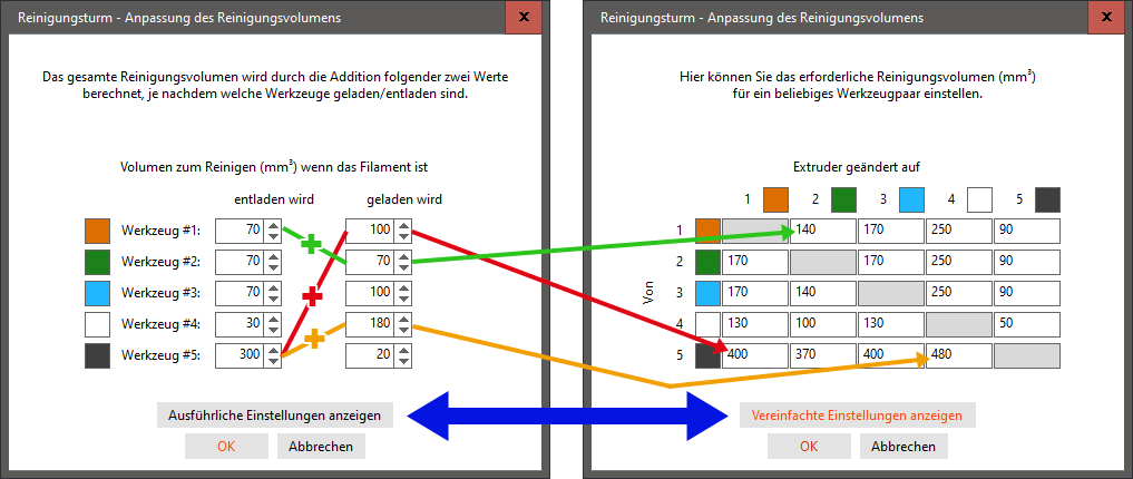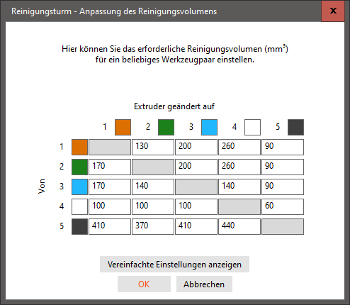 In diesem Fenster gibt es zwei verschiedene Ansichten. Die vereinfachte Standardansicht gibt für jedes Filament eine Menge beim Entladen und beim Laden des Filaments an, d.h. bei der Prusa MMU mit ihren 5 Farben sind dies ingesamt 10 Werte. Die insgesamt herausgedrückte Filamentmenge bei jedem Farbwechsel ergibt sich durch die simple Addition der zwei Spalten. Die erweiterte Ansicht (Ausführliche Einstellungen) erlaubt die genaue Mengenjustierung beim Wechsel jeder Farbe in jede andere mit insgesamt 20 Werten, die sich durch die Addition aller Werte aus der ersten Spalte der einfachen Ansicht mit der zweiten ergeben:
