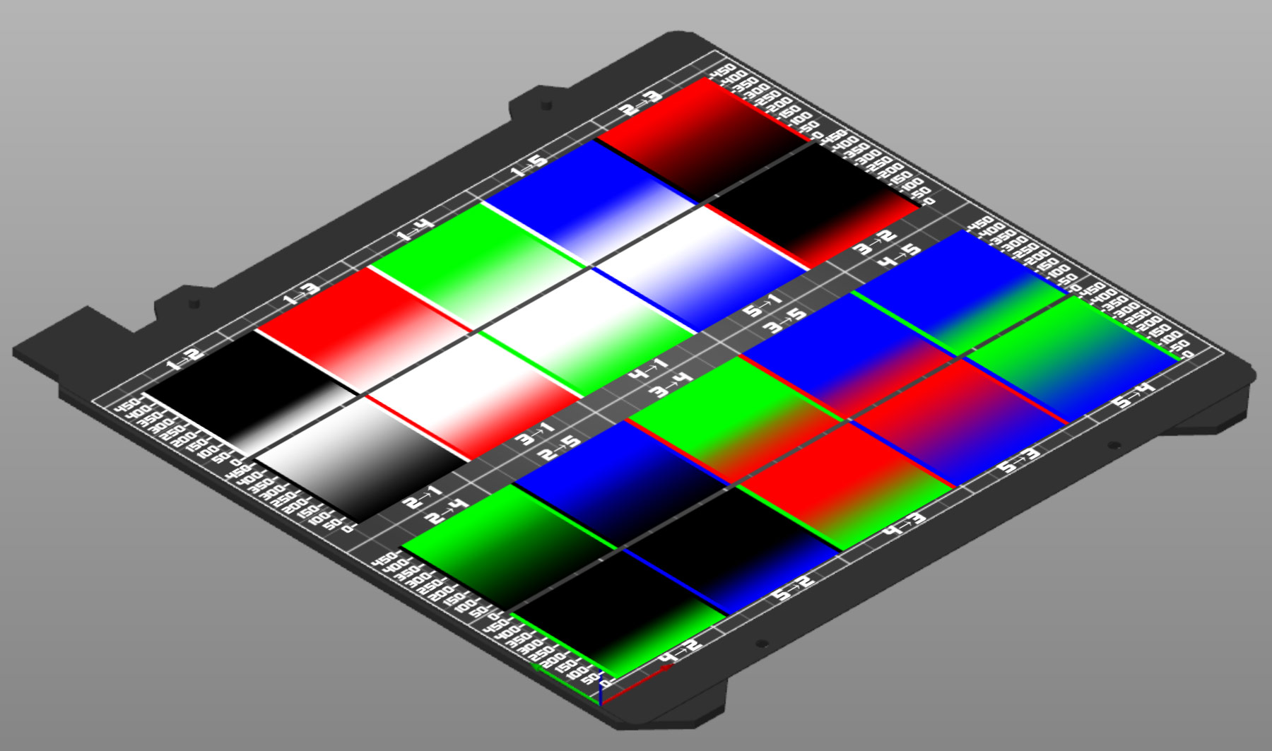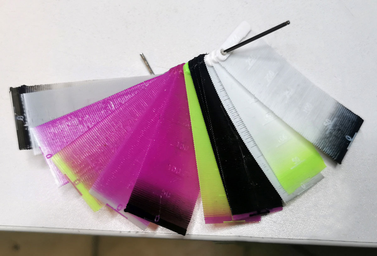 Eine alternative Möglichkeit, die schneller druckt und weniger Filament benötigt, sind speziell präparierte Drucke, die ohne Opferturm arbeiten und alle Wechsel auf einer einzigen Schicht machen, so dass man direkt ablesen kann, ab wieviel Kubikmillimetern kein Farbstich mehr zu sehen ist, das könnte z.B. folgendermaßen aussehen (Symbolbild-Mockup):