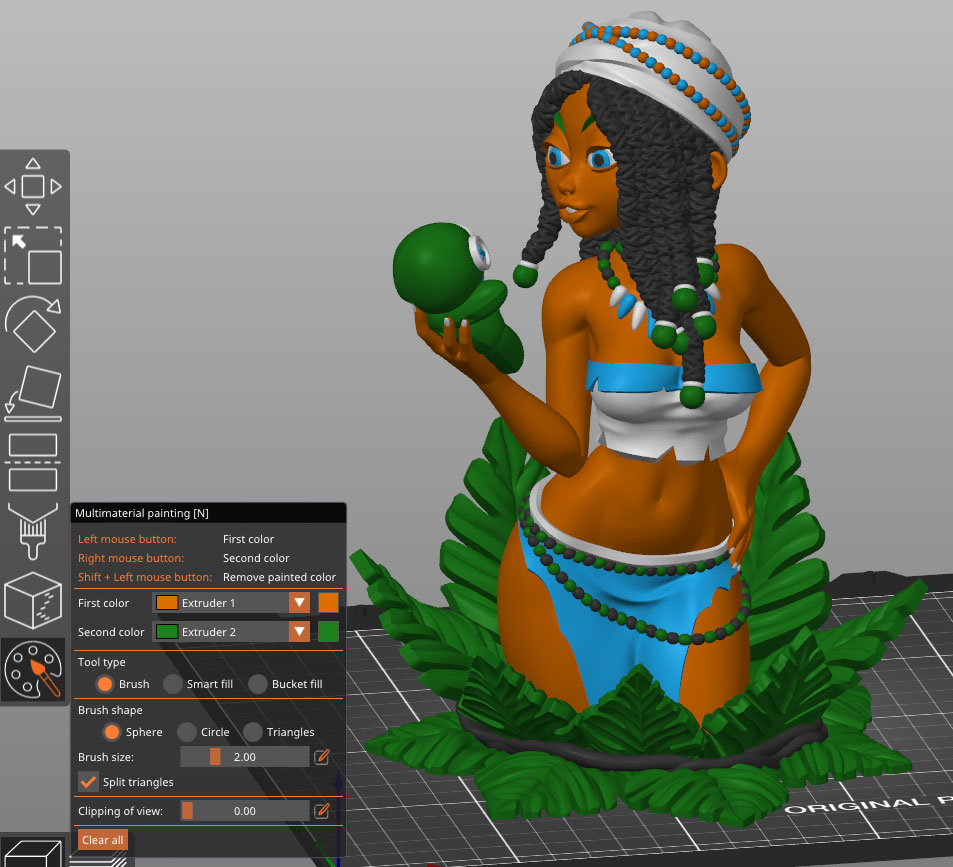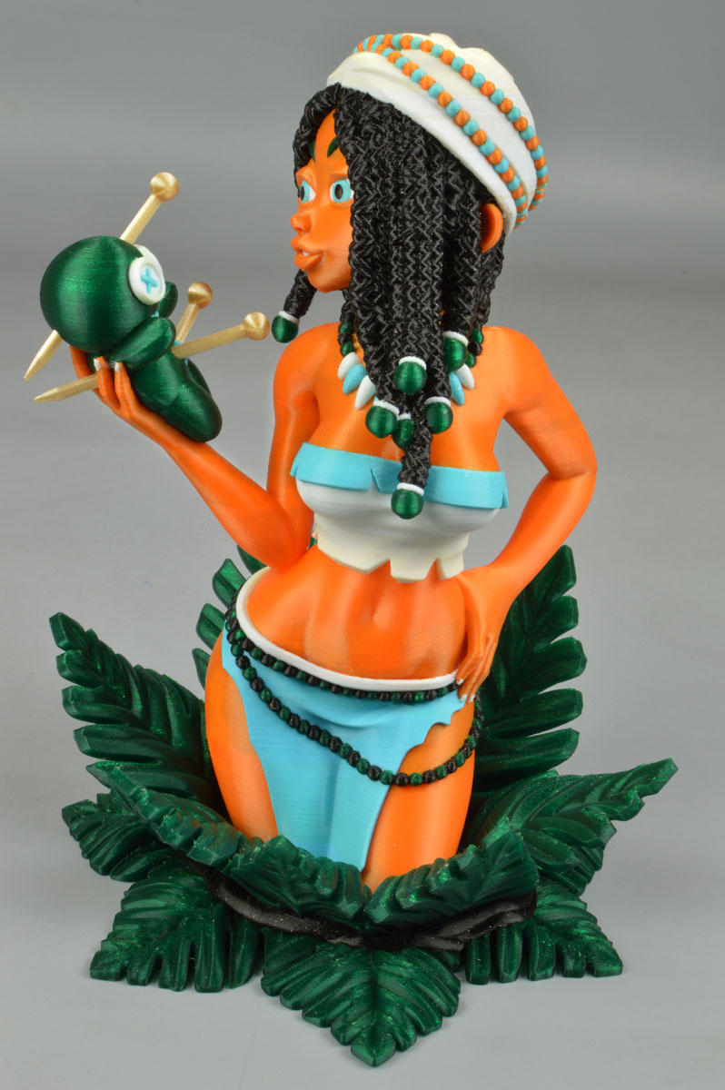 Wir wählen für unseren Test die Farben Ampertec PLA Orange, Hellblau, Weiss und Dunkelgrün transparent, außerdem Schwarz mit Glitzer. Diese Farben wollen wir in unserem Farbdruck des von uns in Prusaslicer bemalten Modells Voodoo Bree von Arte Creator verwenden: