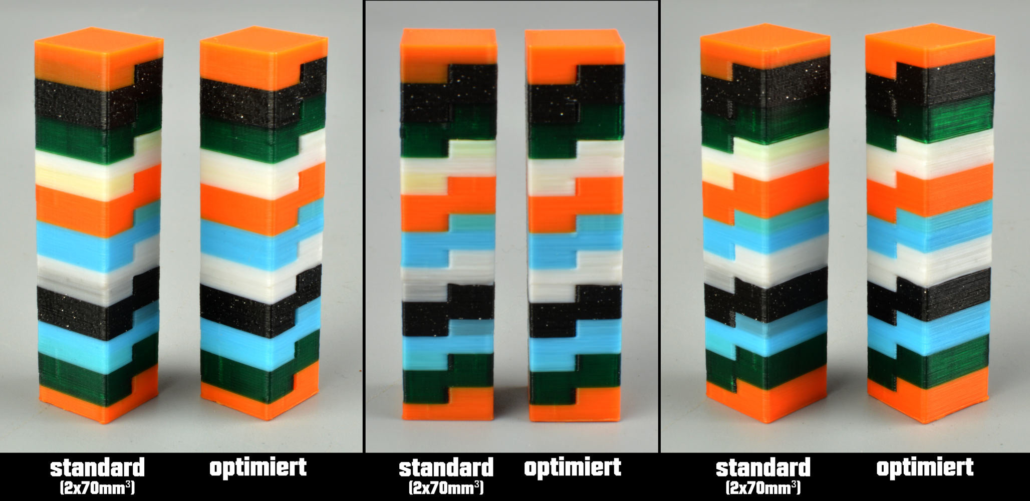 Zeitlich spart man sich nicht so arg viel ein, denn unser vertikaler Test-Turm benötigt auch "nur" 3.5 Stunden zum Druck (es gibt ja immer maximal einen Farbwechsel pro Schicht), der Filamentverbrauch ist beim Turm mit 34 Gramm (in der 140 mm3 Ursprungsvariante) allerdings rund doppelt so hoch. Der Opferturm selbst fällt bei dem Ein-Schichten-Tests weg, da diese Objekt und Opferturm quasi vereinigen. Der größte Vorteil der Einschicht-Lösungen ist jedoch, dass man sie theoretisch nur einmal drucken müssen sollte, um die passenden Werte abzulesen, statt sich schrittweise mittels Testdrucken an die idealen Werte heranzutasten wie mit unserem Turm.