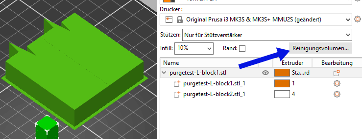 Nach dem ersten Druck mit den 2x70 Kubikmillimeter Standardeinstellungen passen wir die Werte an und tasten uns schrittweise an die optimalen Werte, indem wir einige zweifarbige Farbwechsel-Testvarianten drucken um zu sehen, wieviel wir jeweils purgen müssen. Am Ende sind dies die optimalen Werte: