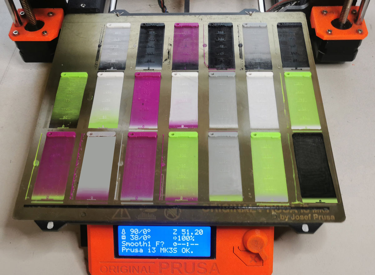 Hier wird es jedoch mit zunehmender Farbenanzahl eng auf dem Druckbett. Für die 20 Farbwechselkombinationen einer MMU2, wenn man pro Filamentwechsel bis zu 450 Kubikmillimeter testet (was z.B. bei schwarz zu weiss durchaus nötig sein kann), benötigt dies bei 0,00124 Gramm pro Kubikmillimeter (die Dichte von PLA ist 1,24g pro Kubikzentimeter) 11,16g Filament - was bei maximal 13 Gramm für eine 0.2mm dicke erste Schicht eines komplett gefüllten MK3-Druckbetts eng wird. Einige Maker haben bereits entsprechende 3MF-Modelle und GCodes erstellt, z.B. hier von Maker Posix oder hier von Maker mcfada. Besonders der letztere Test, der 2 Stunden und 48 Minuten zum Druck benötigt und dabei nur rund 18 Gramm Filament verbraucht, ist sehr praktisch, da er besonders kompakt ist und die Kubikmillimeterzahl direkt auf den Farbwechsel-Swatch druckt: